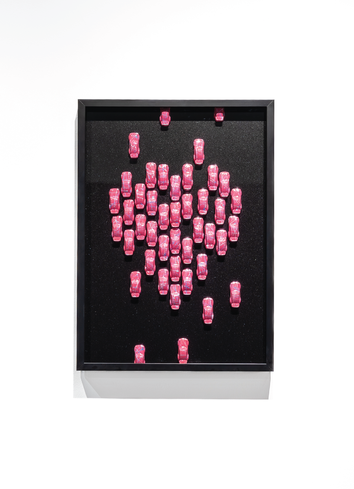This creation unites precision and emotion. On an aluminum composite surface, forty-two meticulously hand-painted miniature cars, each measuring seven centimeters, come together to form an infinite heart, the origin point of the Infinity Love project. Every element contributes to a rhythmic and harmonious composition, where repetition transforms into meaning.