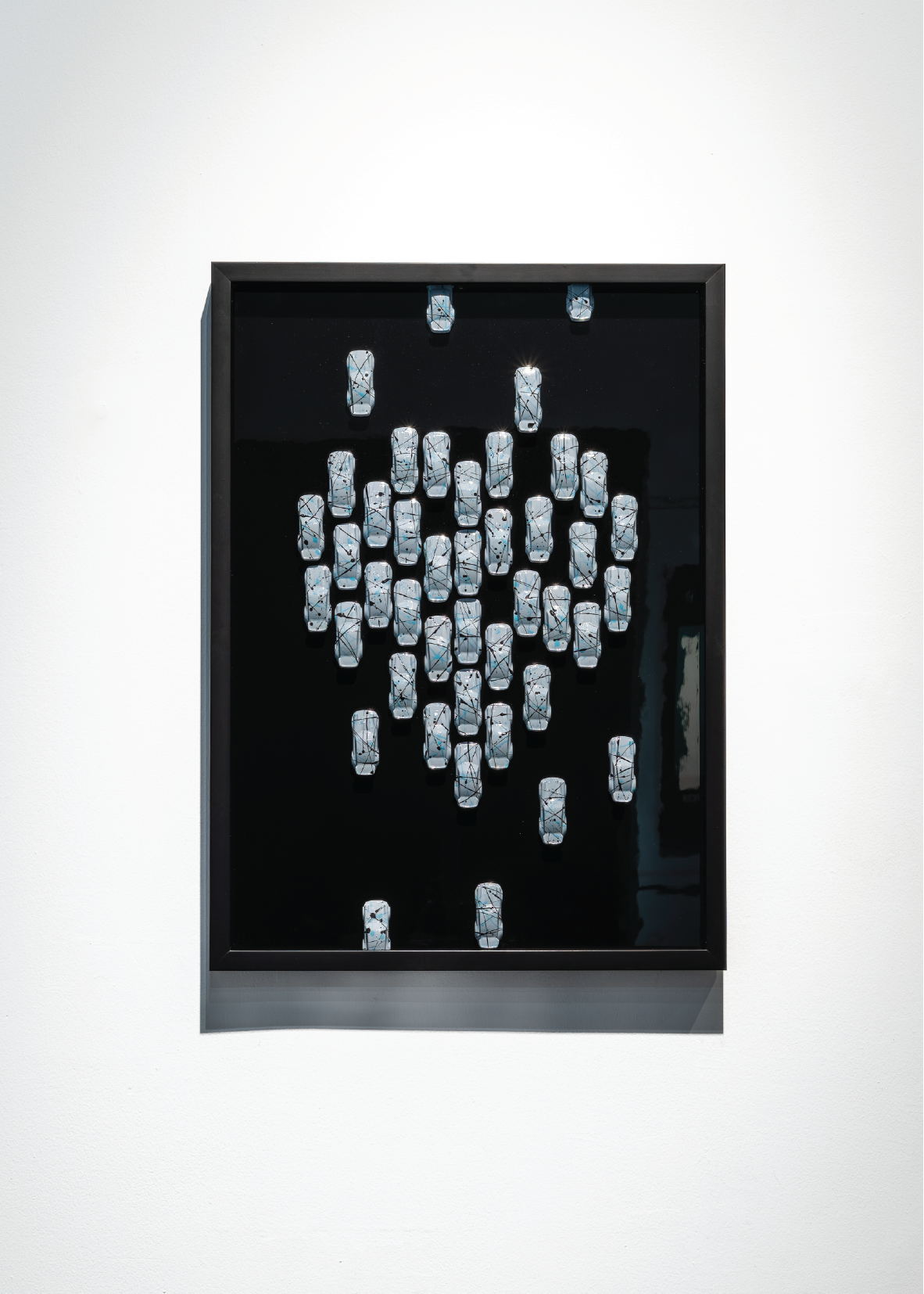 This creation unites precision and emotion. On an aluminum composite surface, forty-two meticulously hand-painted miniature cars, each measuring seven centimeters, come together to form an infinite heart, the origin point of the Infinity Love project. Every element contributes to a rhythmic and harmonious composition, where repetition transforms into meaning.